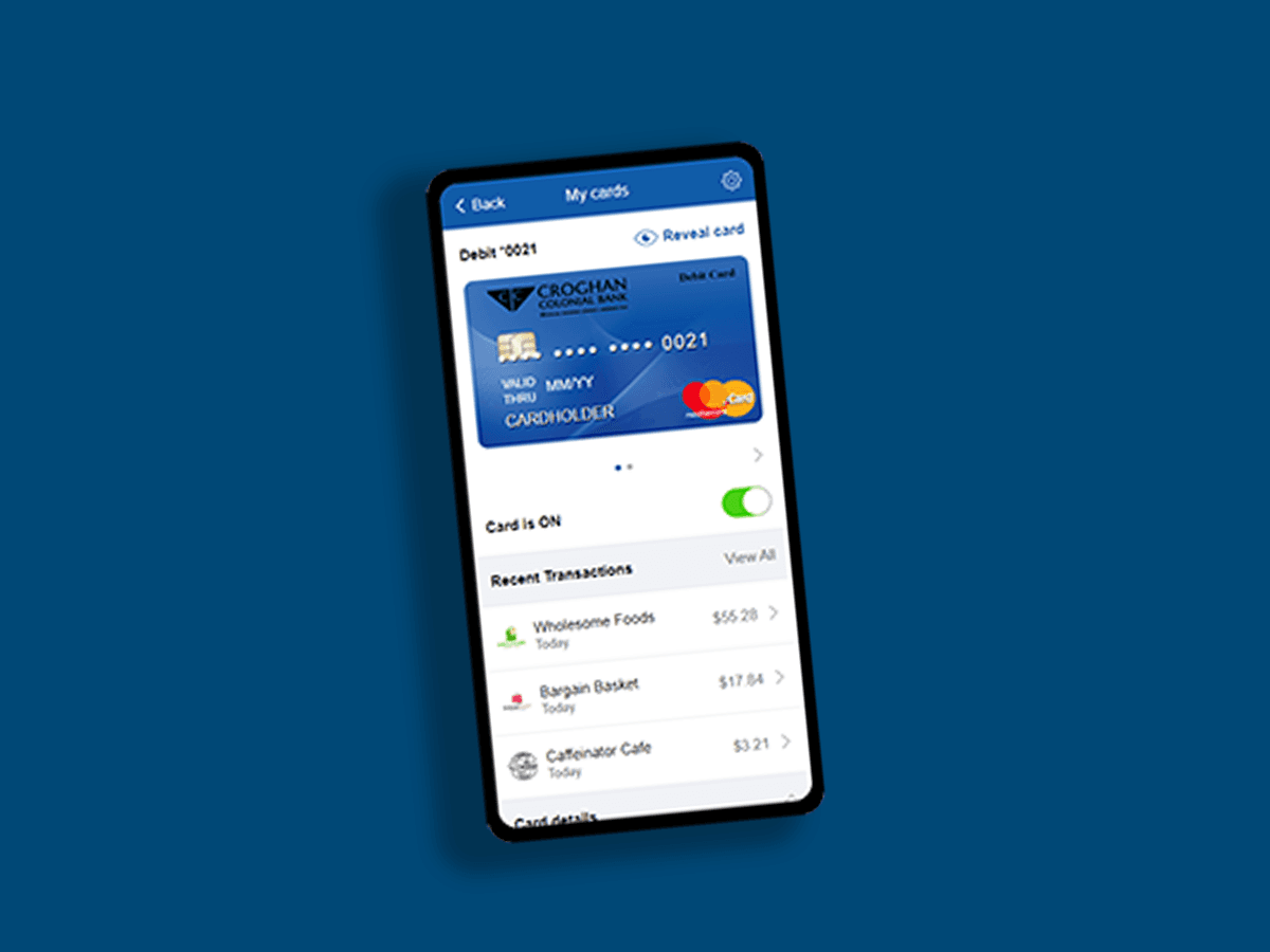 Card Management is at your fingertips with the Croghan Mobile Banking App. Tracking your card activity can be done with the touch of a button, and you can easily monitor your transactions and spending activity.