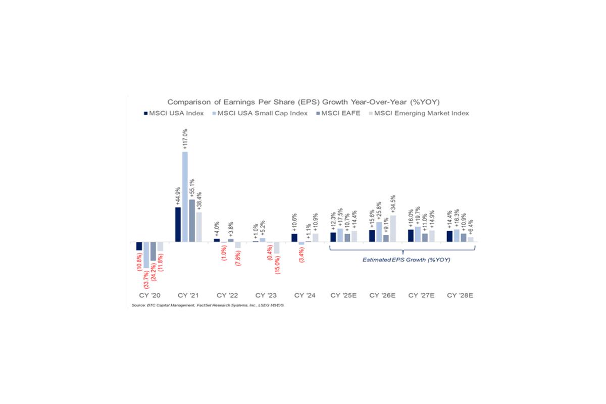 - Note for CY ‘26, CY ‘27, and CY ‘28 analysts currently estimate growth in EPS for U.S. large-cap, as measured by the MSCI USA Index, to materially exceed that of foreign developed, measured by the MSCI EAFE Index.