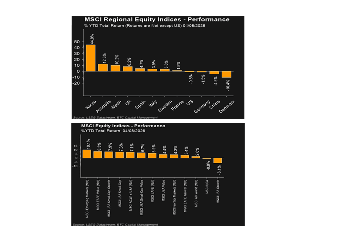 - MSCI indices (left chart, data as of 04/08/2026) YTD exhibit a continuation of trends exhibited throughout Q1 2026: