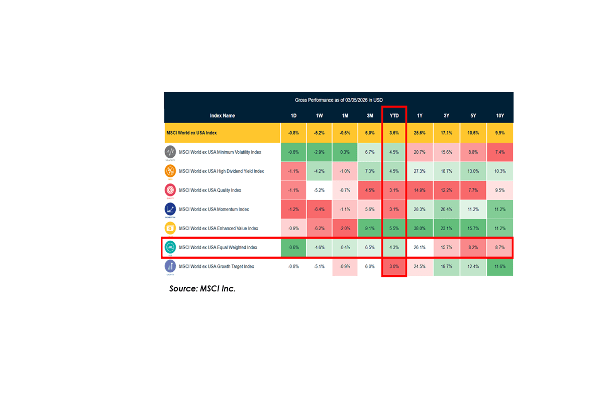 - Similar to the USA Index, Enhanced Value has been the best performing factor YTD. Historically, this factor has exhibited relative outperformance over the broader index, different from the USA Index in which Quality has been the predominant factor of performance.