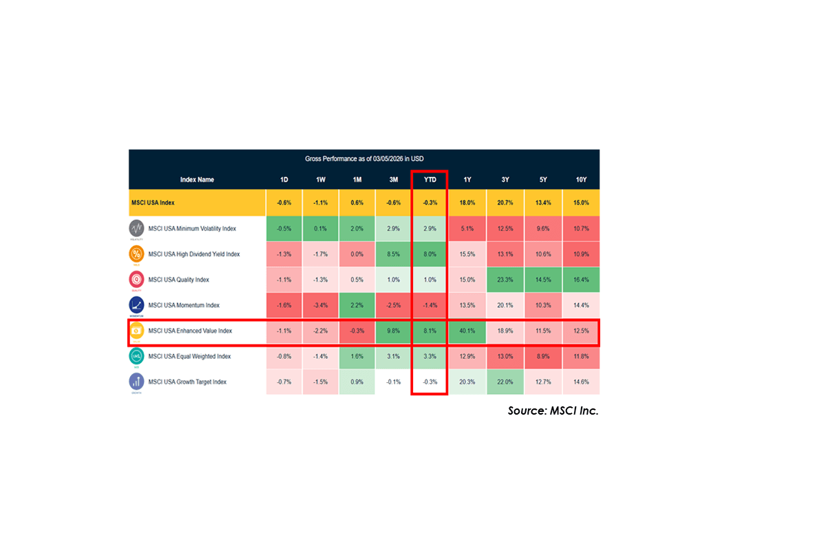 - YTD, the Enhanced Value Index, which exhibits the performance of securities that exhibit higher value characteristics relative to their peers within the corresponding GICS® sector, has been the best performing factor. The value investment-style characteristics for index construction are defined using three variables: Price-to-Book Value, Price-to-Forward Earnings and Enterprise Value-to-Cash flow from Operations.