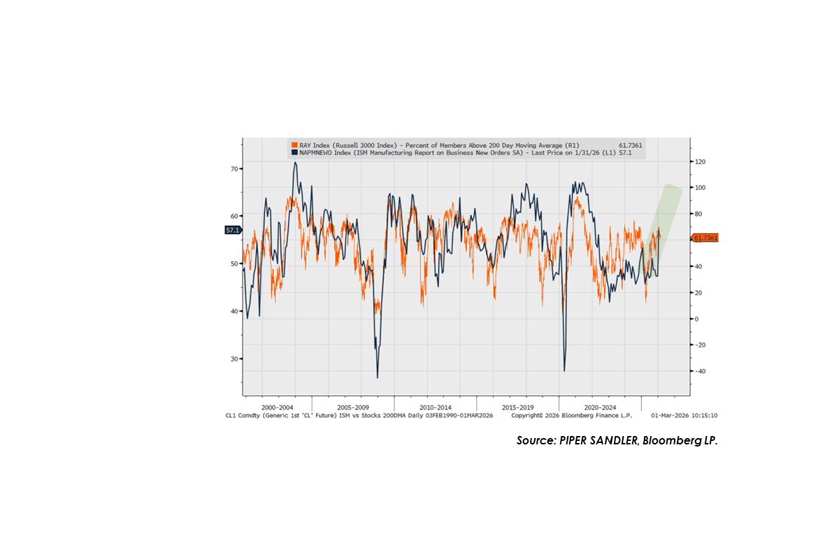 - A strong correlation exists between the ISM Manufacturing PMI New Orders and the trend and breadth of overall equity market price movement. This chart presents the trend of the new orders series compared to the percent of Russell 3000 companies whose current price exceeds their 200 daily-moving average.